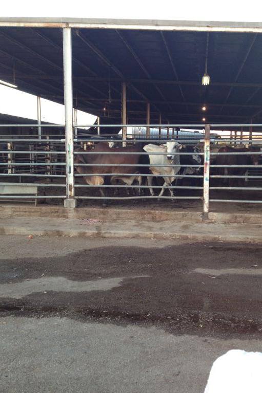 When we got closer to the enclosures where all the animals were kept, the first thing we saw were about 6 bulls in an approximately 10m x 10 m enclosure (my own estimation from memory) standing on a mixture of urine and feces. They were all close to each other, occupying about half the available space. I approached towards the enclosure and petted one of the big bulls – the white one in the picture above. Unlike the other 5 who were in a state of near-panic, 2 of which were repeatedly urinating, 2 constantly moving around the 6-strong herd and the last one remaining completely still, the big white one seemed relatively calm. He’s the one who approached me.